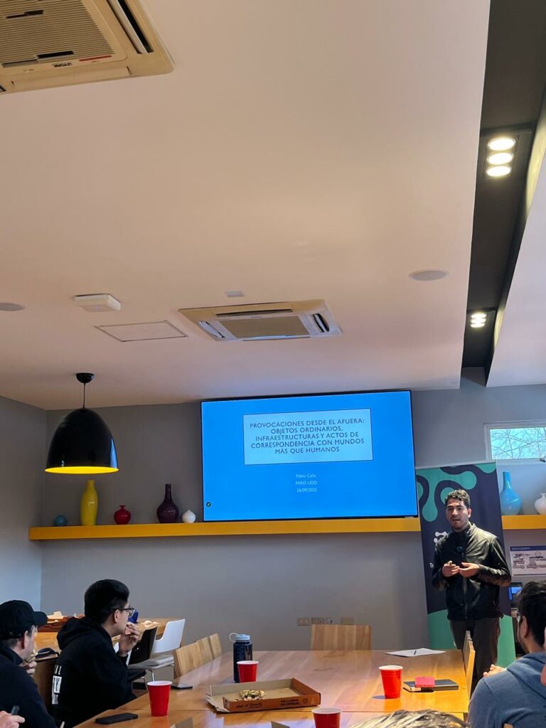 Por su parte, Pablo Celis presentó reflexiones derivadas de una investigación etnográfica realizada en una startup de innovación y sustentabilidad. Su trabajo abordó las prácticas y tecnologías orientadas a generar alianzas y correspondencias con “mundos más que humanos”. En este marco, planteó la necesidad de repensar nuestra relación con otras formas de vida a través de la creación de nuevos arreglos socio-materiales que permitan materializar espacios de convivencia con entidades no humanas frecuentemente olvidadas o descartadas.