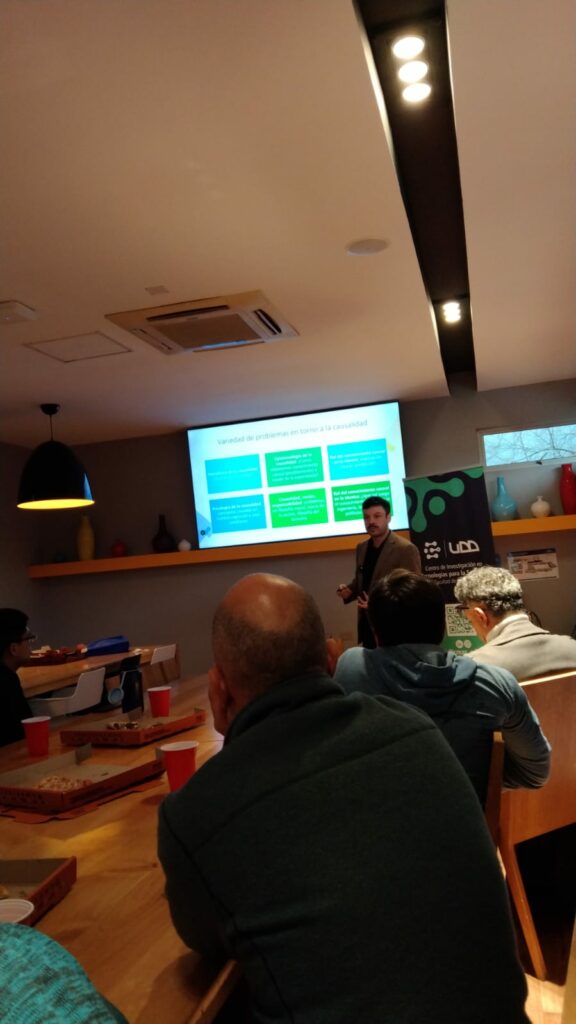 Lucas Miranda expuso su investigación titulada “Algunos aportes de la filosofía a los problemas de inferencia causal”. En ella explicó cómo la causalidad, que había sido relegada del lenguaje filosófico y científico durante la primera mitad del siglo XX, adquirió un rol protagónico en el desarrollo de una ciencia de la inferencia causal. Entre los factores que marcaron este cambio destacó el declive de la influencia del positivismo lógico y los avances en el análisis filosófico de la metafísica y la epistemología de la causalidad.