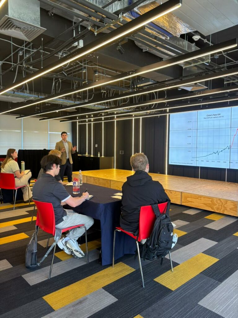 Durante su presentación, Órdenes explicó cómo la economía chilena transitó desde un modelo caracterizado por una fuerte protección comercial y una amplia participación del Estado, hacia un esquema de libre mercado y abierto al comercio internacional. Este proceso, señaló, marcó un punto de inflexión en la forma de organizar la actividad económica y la inserción del país en la economía global.