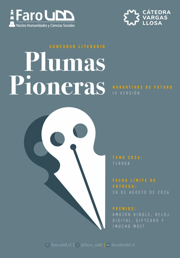 Estamos convocando a alumnos de enseñanza media de todo Chile y a los alumnos de la UDD que quieran participar de la cuarta versión de nuestro concurso literario llamado “Plumas Pioneras, Narrativas de Futuro”, organizado por Faro UDD y la Cátedra Vargas Llosa.