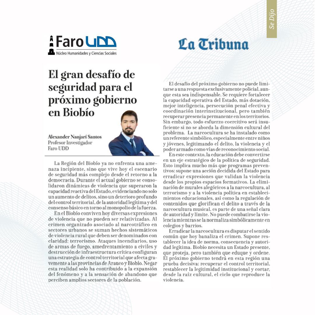 24.01.2026 Alexander Nanjarí: El gran desafío de seguridad para el próximo gobierno en Biobío en La Tribuna