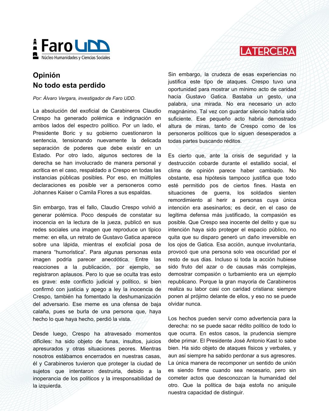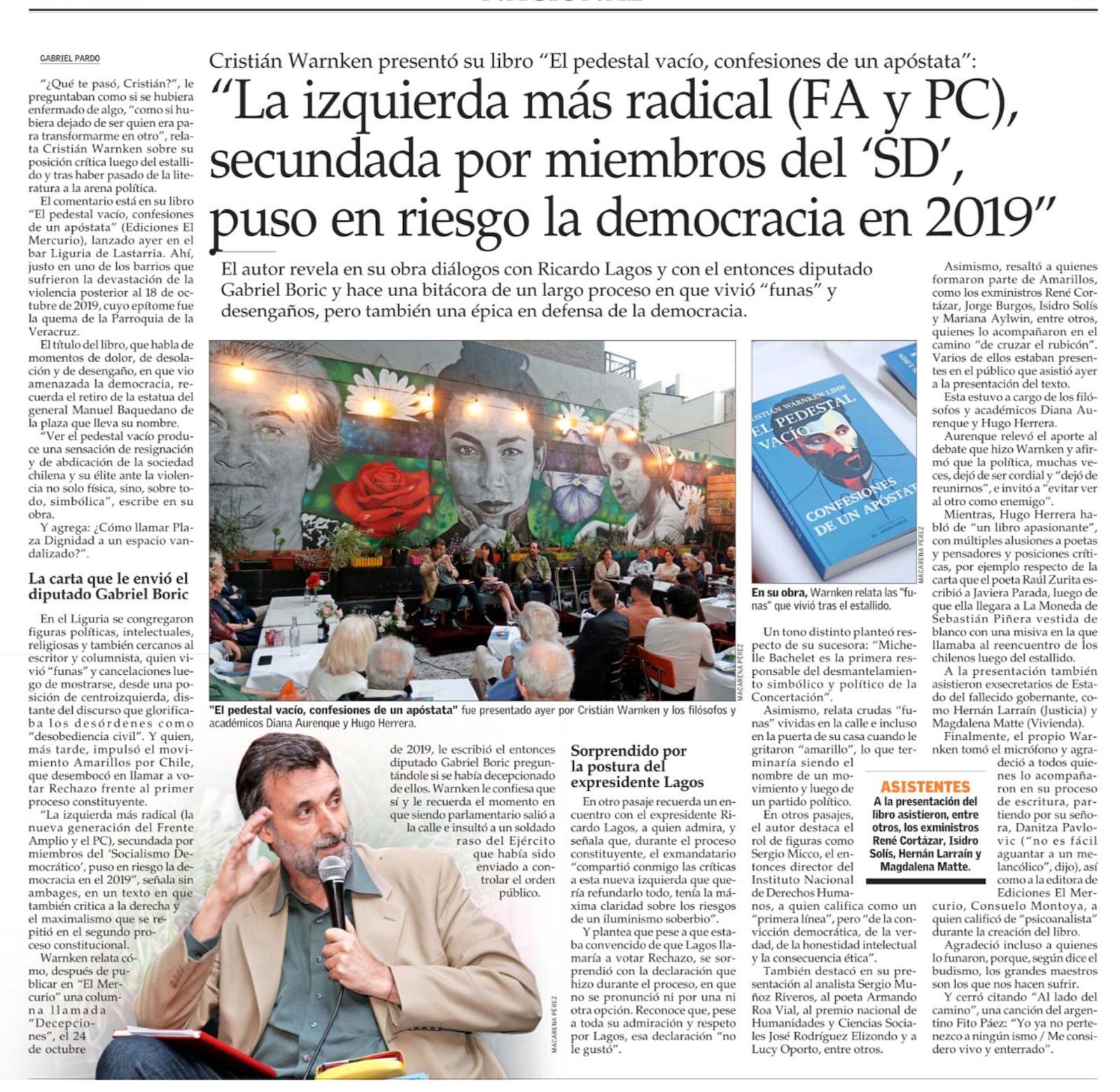 15.01.2026 Cristián Warnken: La izquierda más radical puso en riesgo la democracia en 2019 en El Mercurio