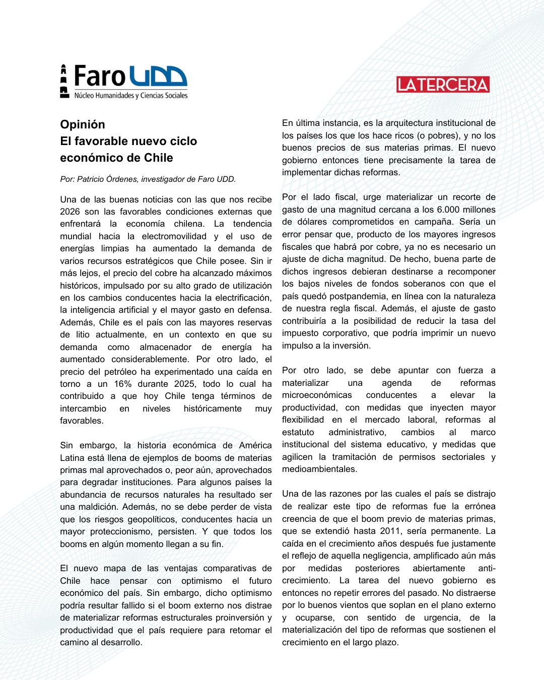 Patricio Órdenes: El favorable nuevo ciclo económico de Chile