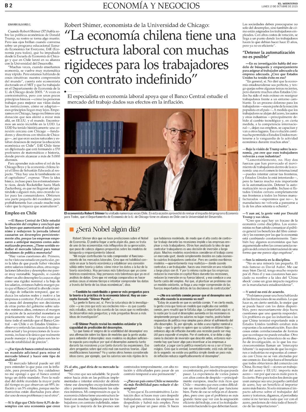 13.10.2025 Robert Shimer: La economía chilena tiene una estructura laboral con muchas rigideces para los trabajadores con contrato indefinido en El Mercurio